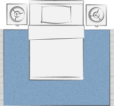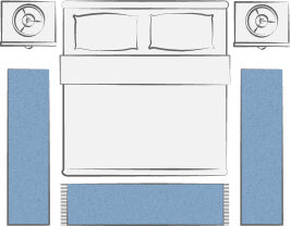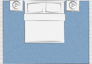 For a bedroom rug, the size of your bed will determine the size of the rug. Placement is traditionally perpendicular to the bed with the front legs on top and plenty of rug visible on all sides. The foot of the bed will reach about halfway across the rug. For a twin or full-sized bed, a 5x7 rug fits nicely while an 8x10 or 9x13 is best for a queen-sized bed. A king-sized bed needs a king-sized rug so get the largest one you can to keep the room looking magnificently spacious. All placements should leave 18 to 24 inches of floor space around the rug.