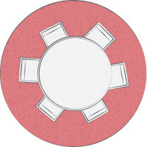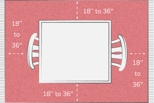 Chair legs should remain fully on the rug whether tucked in or pulled out, with 18 to 36 inches of rug extending from each edge of the table. Remember to account for any extendable leaves and keep 18 inches of floor space between the rug and wall. For oval and rectangular tables a 5x7 rug is best for seating 2-4 people. To seat 6-8, an 8x10 or 9x13 rug is recommended. Square and round tables seating 4-6 pair perfectly with a 7 or 9-foot round rug.